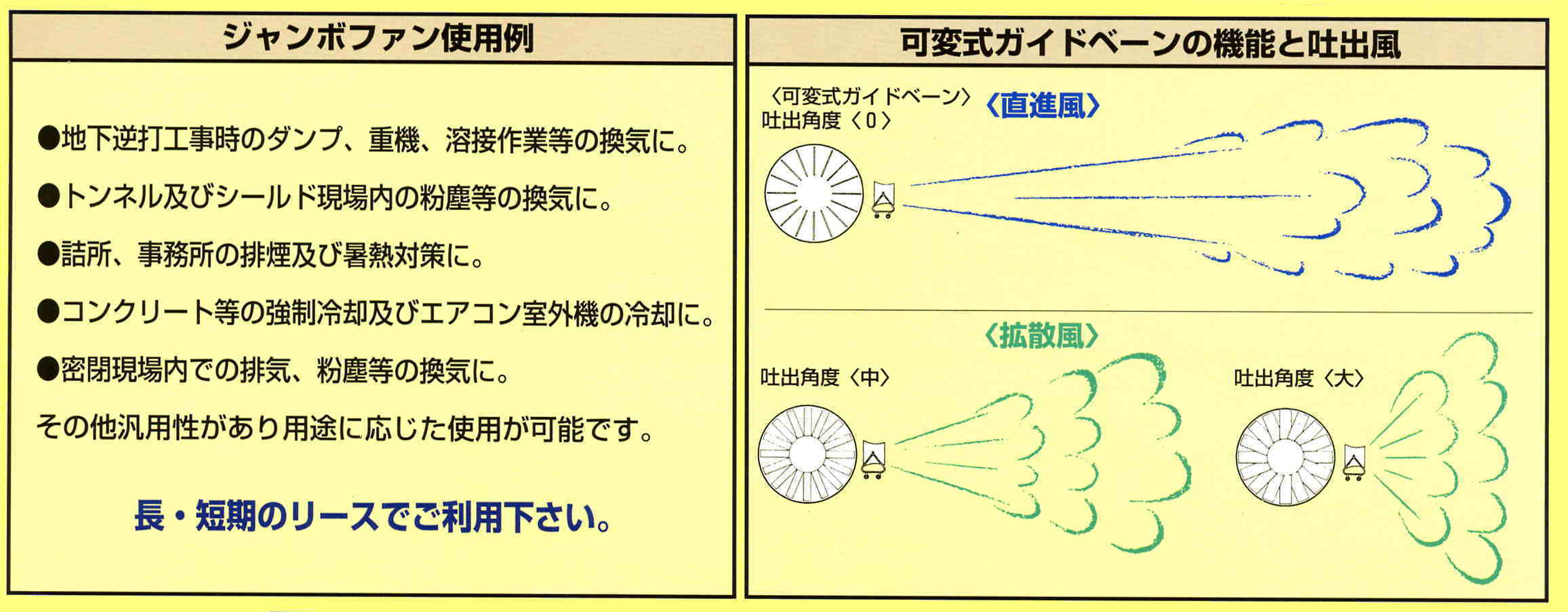 ジャンボファンは可変式ガイドベーン調整により「風の到達距離70m」・「大風量」・「低騒音」・「省エネタイプ」目的に応じた最適な気流作りで快適な作業環境づくりにお役立てください。